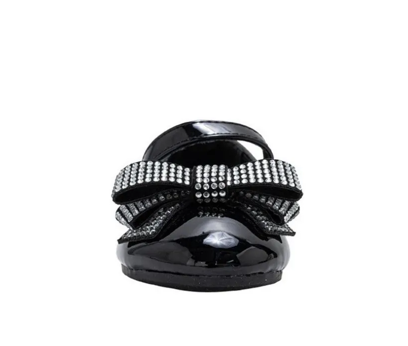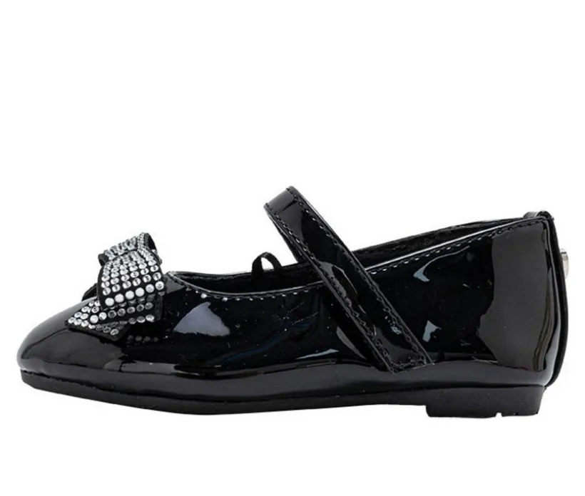 Add a touch of sparkle and elegance to her wardrobe with these adorable toddler ballet flats. Designed with a glossy patent finish and topped with a rhinestone bow, they bring shine to both special occasions and everyday outfits. The elastic strap provides a secure fit for active toddlers, while the soft inner lining and flexible sole keep her comfortable all day. Perfect for pairing with dresses, skirts, or leggings, these flats deliver both charm and comfort.