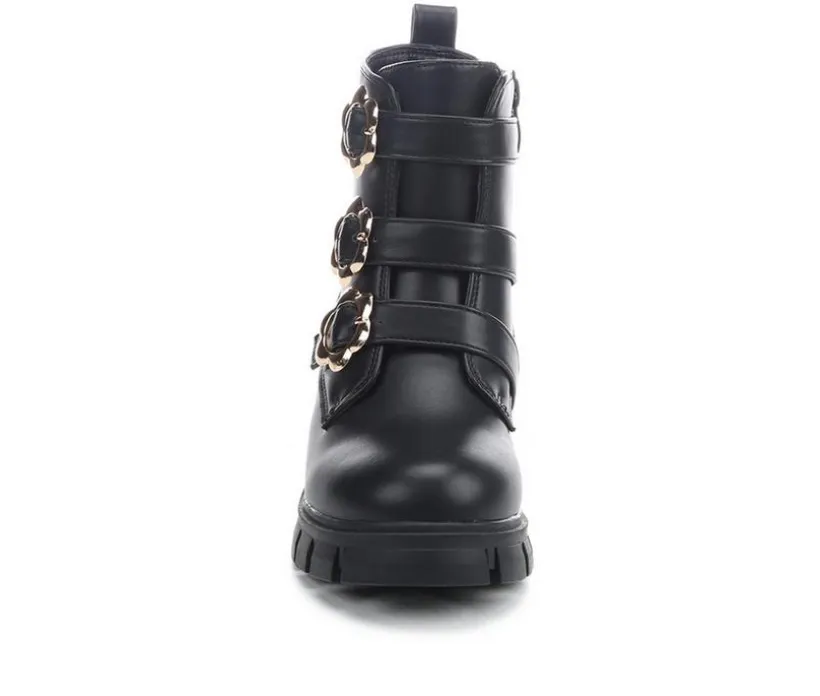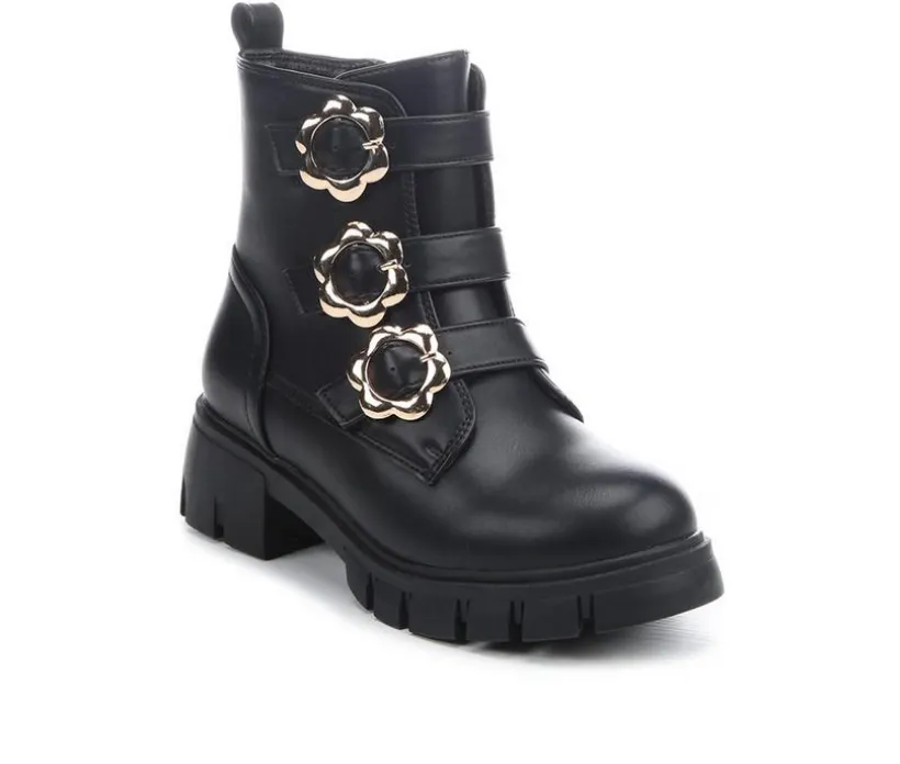 Give her bold style with a playful twist in the Girls’ MIA PIPYER Boots. This combat-inspired silhouette features a smooth finish with three front straps secured by sunflower-shaped gold-tone clips for standout flair. A side zipper makes them easy to get on and off, while the back pull tab adds extra convenience. Set on a sturdy outsole with a small block heel, these boots combine fashion and function for everyday adventures.