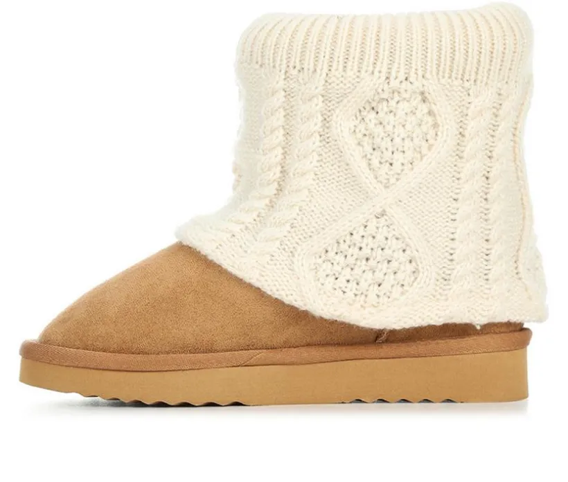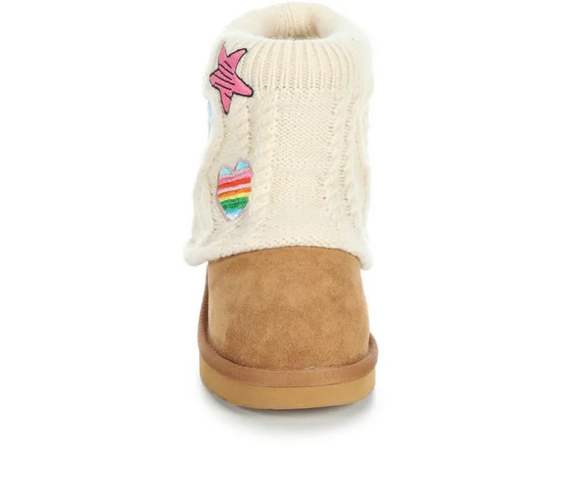 Fun and cozy come together in the Girls’ Steve Madden JFrosty Boots. This playful winter boot features a soft suede-like base with a sweater-knit shaft covered in colorful patch accents that make every step shine. A plush lining keeps her feet warm and comfortable, while the sturdy outsole provides reliable traction. Easy to slip on, these boots bring warmth, comfort, and personality to her cold-weather looks.