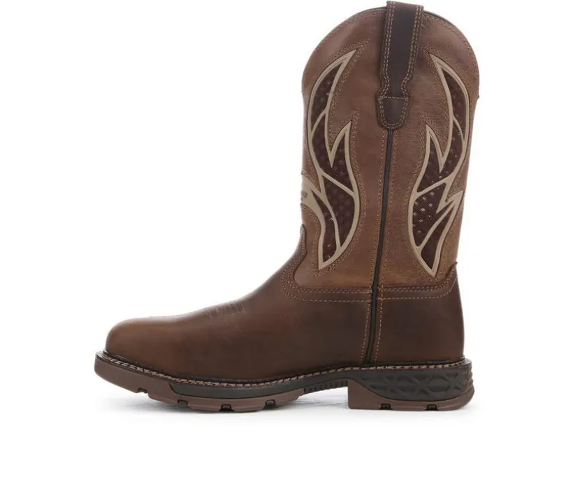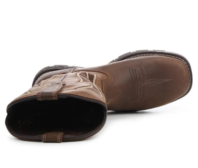 Blending Western flair with jobsite functionality, this rugged pull-on work boot is built to handle long days on tough terrain. Its dual-tone shaft features bold stitching and reinforced pull loops for easy on and off, while the broad square toe offers roomy comfort. The slip- and oil-resistant outsole delivers dependable traction, and the durable welt construction enhances stability and longevity. Designed for comfort and grit, this boot transitions easily from work to after-hours wear.